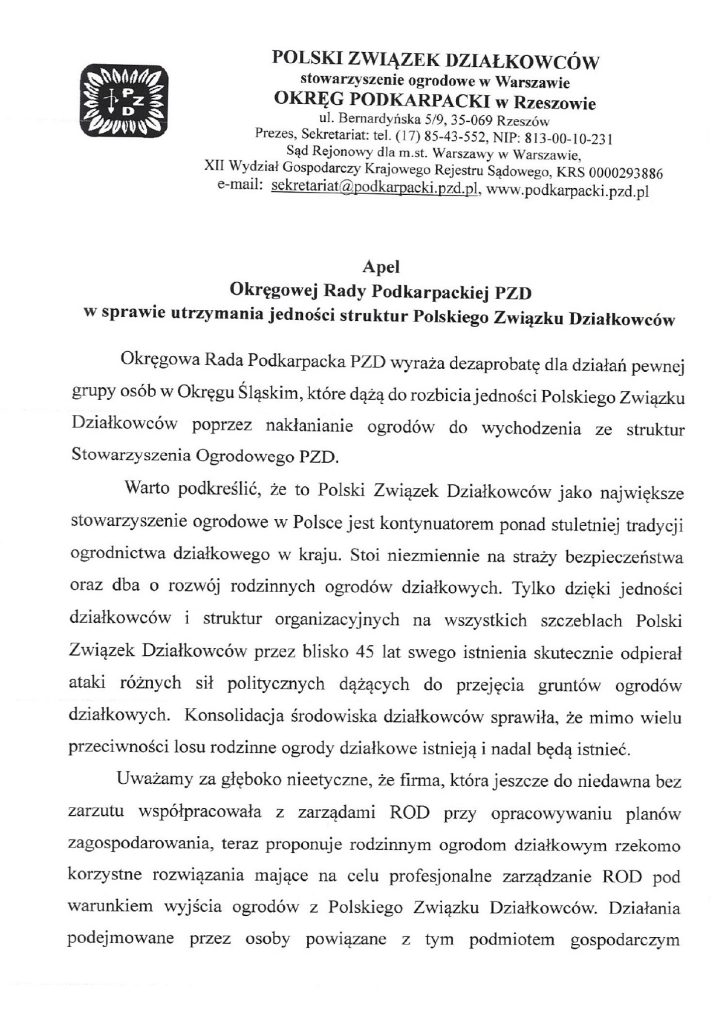 Apel Okręgowej Rady Podkarpackiej PZD w sprawie utrzymania jedności struktur Polskiego Związku Działkowców – 19.12.2025