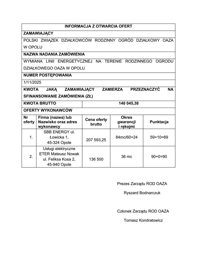 Informacja ROD „Oaza” w Opolu z otwarcia ofert – 12.11.2025 r.
