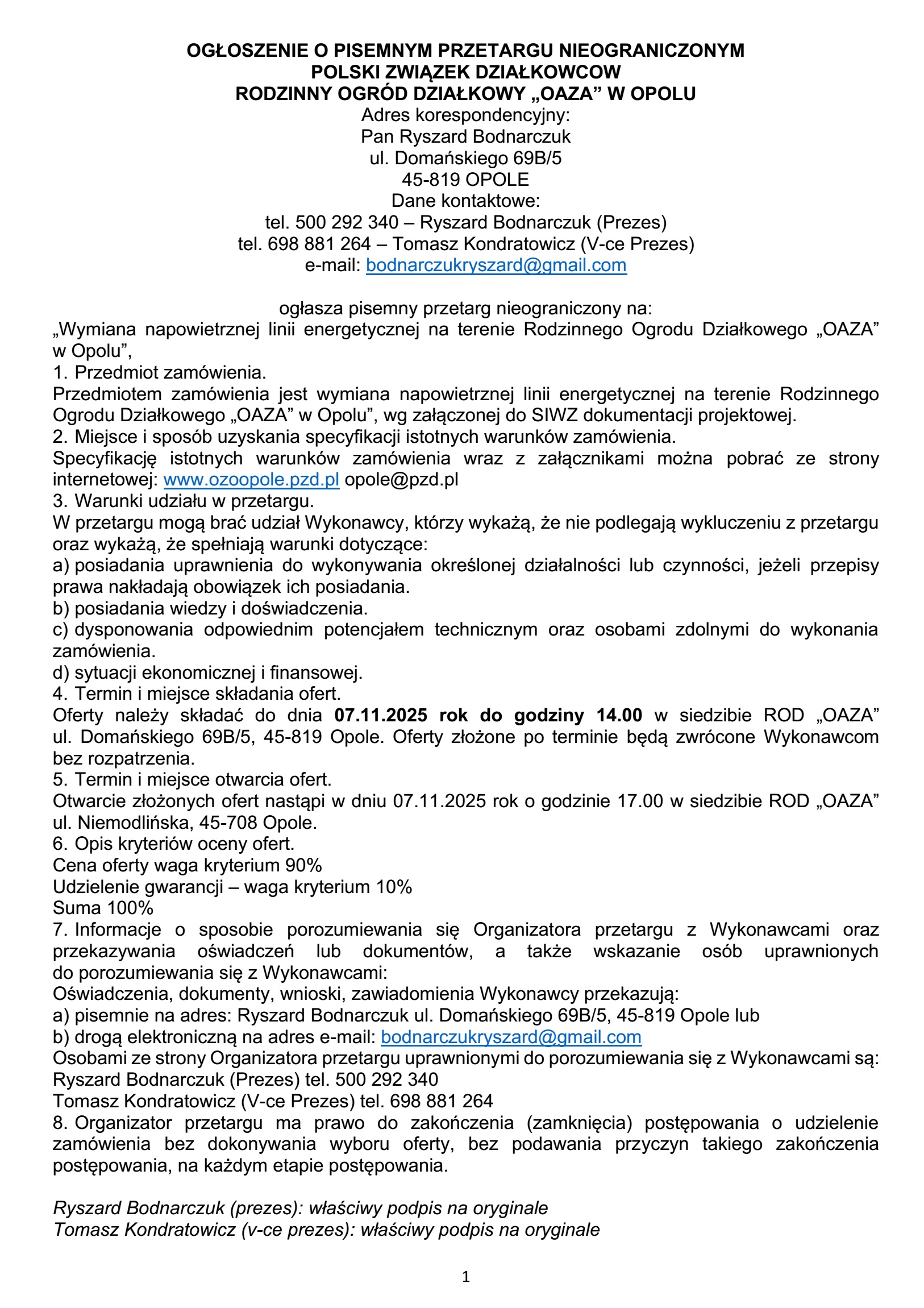 Rodzinny Ogród Działkowy „Oaza” w Opolu ogłasza pisemny przetarg nieograniczony: „Wymiana napowietrznej linii energetycznej”