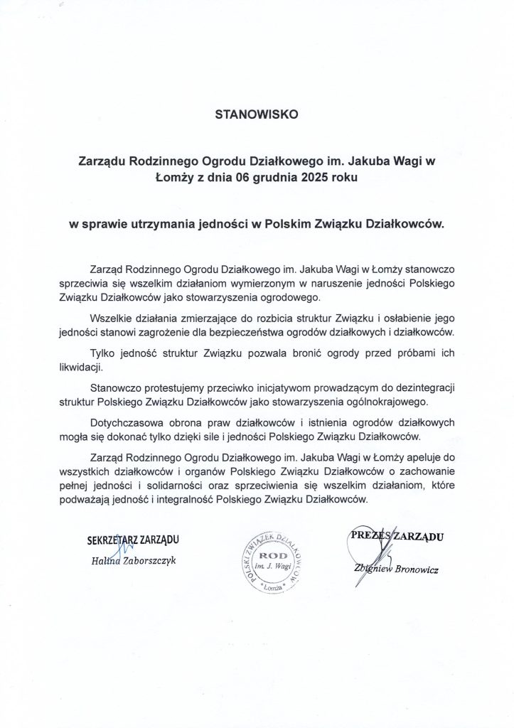 Stanowiska Zarządu Rodzinnego Ogrodu Działkowego im. Jakuba Wagi w Łomży z dnia 6 grudnia 2025 r. w sprawie utrzymania jedności w Polskim Związku Działkowców – 08.12.2025
