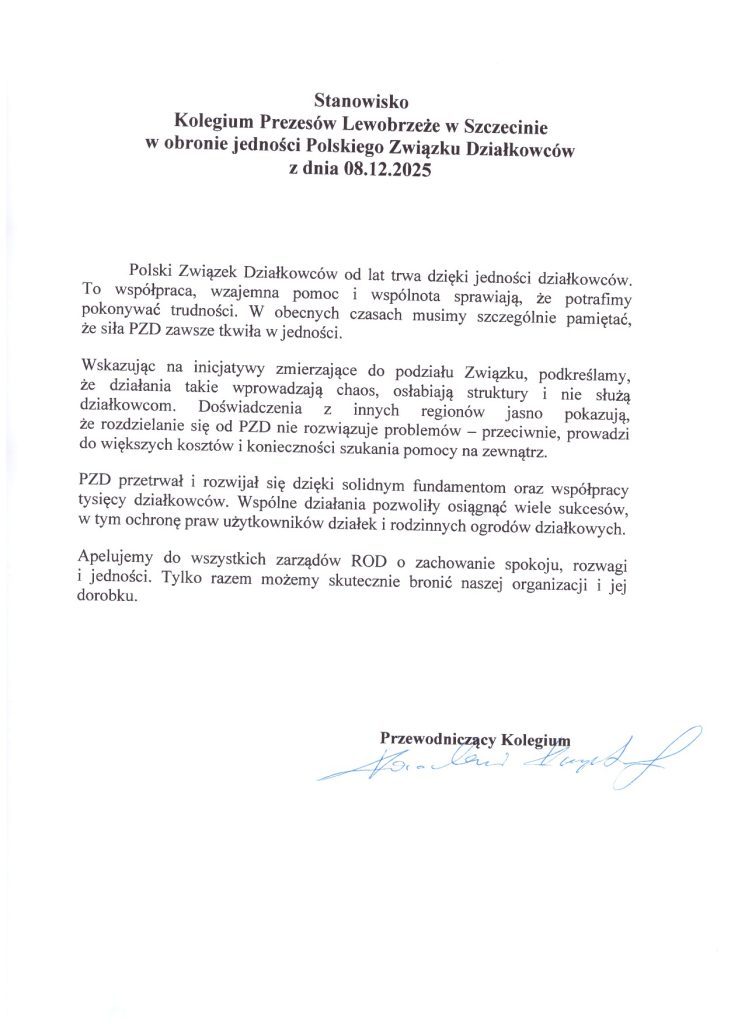 Aktualności Listy, Komunikaty Stanowisko Kolegium Prezesów Lewobrzeże w Szczecinie w obronie jedności Polskiego Związku Działkowców z dnia 8.12.2025 r. – 12.12.2025 15 grudnia 2025 OZO PZD