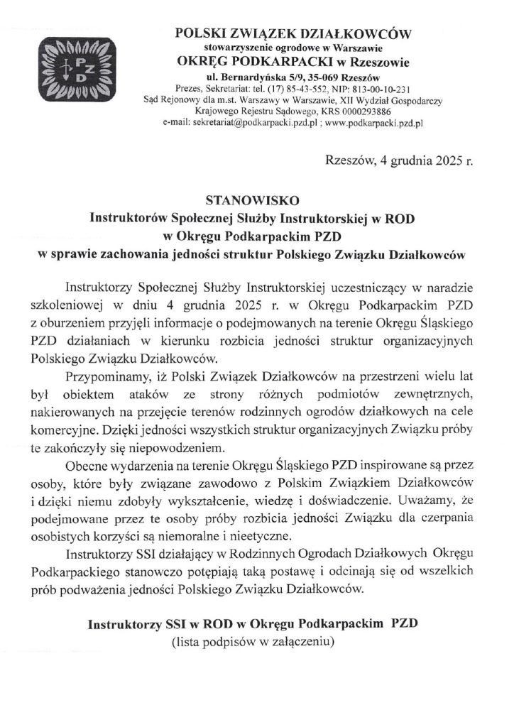 Stanowisko Kolegium Prezesów Prawobrzeża Szczecin w obronie jedności Polskiego Związku Działkowców z dnia 29.11.2025 r. – 08.12.2025