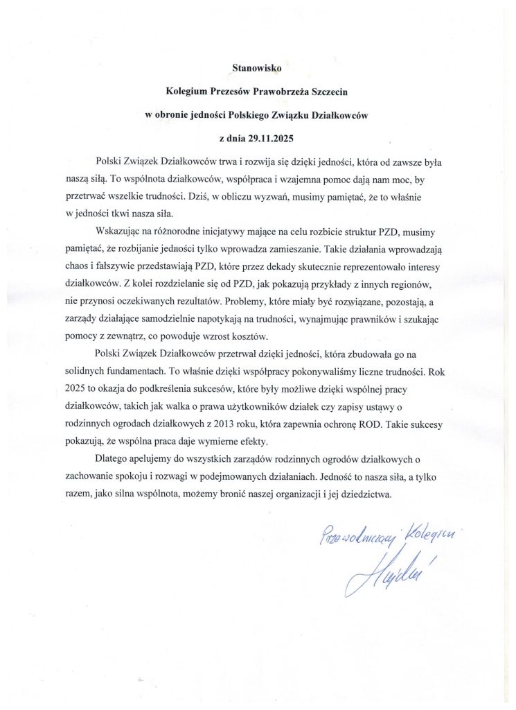 Aktualności Listy, Komunikaty Stanowisko Kolegium Prezesów Prawobrzeża Szczecin w obronie jedności Polskiego Związku Działkowców z dnia 29.11.2025 r. – 08.12.2025 9 grudnia 2025 OZO PZD