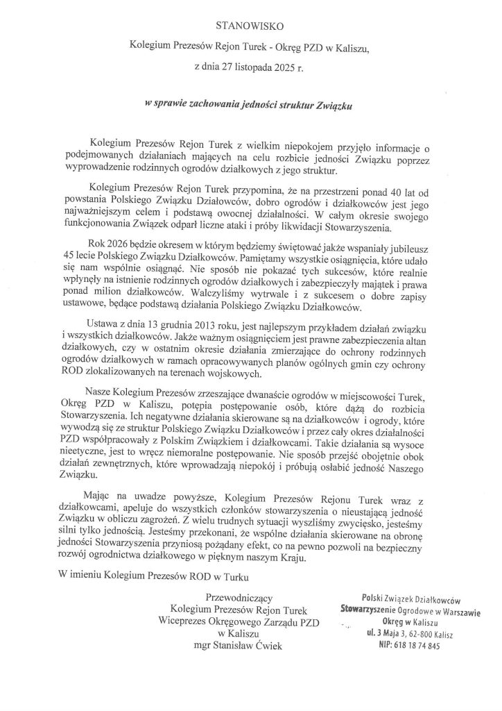 Stanowisko Kolegium Prezesów Rejon Turek-Okręg PZD w Kaliszu z dnia 27 listopada 2025 r. w sprawie zachowania jedności struktur Związku – 02.12.2025