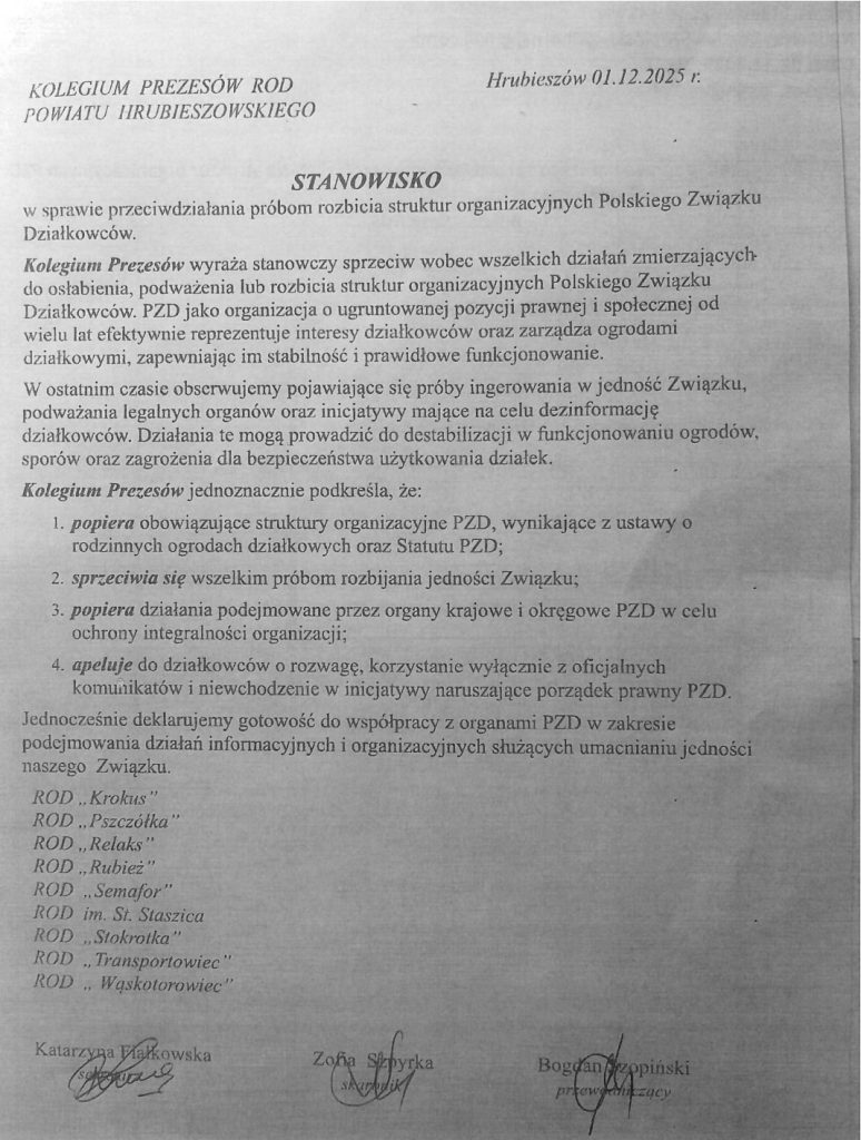 Stanowisko Kolegium prezesów ROD powiatu Hrubieszowskiego w sprawie przeciwdziałania próbom rozbicia struktur organizacyjnych PZD – 04.12.2025