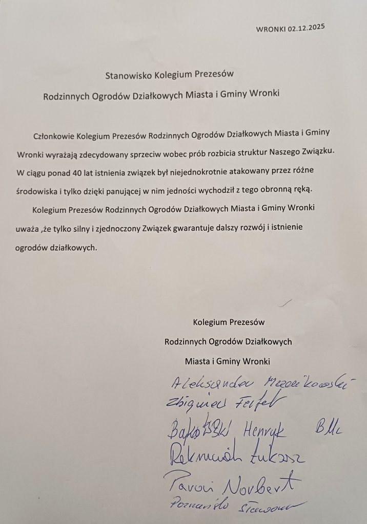 Aktualności Listy, Komunikaty Stanowisko Kolegium Prezesów Rodzinnych Ogrodów Działkowych Miasta i Gminy Wronki – 08.12.2025 9 grudnia 2025 OZO PZD