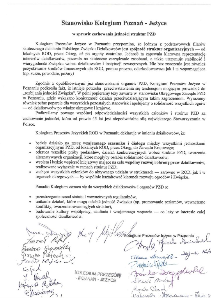 Stanowisko Kolegium ROD Poznań-Jeżyce w sprawie zachowania jedności Polskiego Związku Działkowców – 16.12.2025