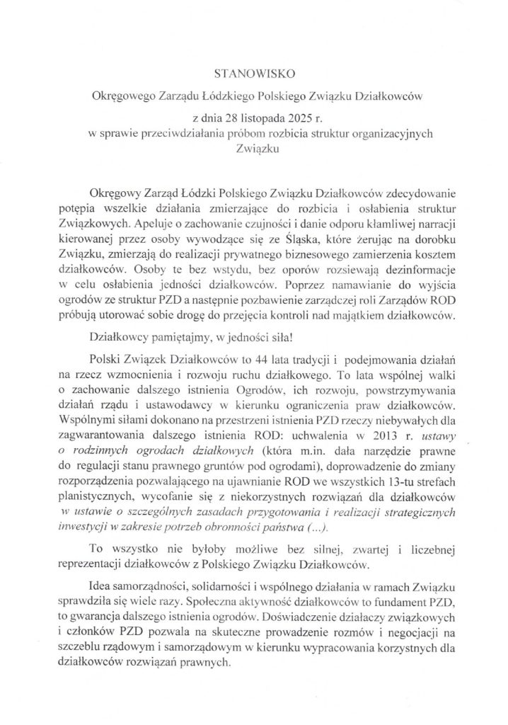 Stanowisko Okręgowego Zarządu Łódzkiego w sprawie przeciwdziałania próbom rozbicia struktur organizacyjnych Związku – 01.12.2025