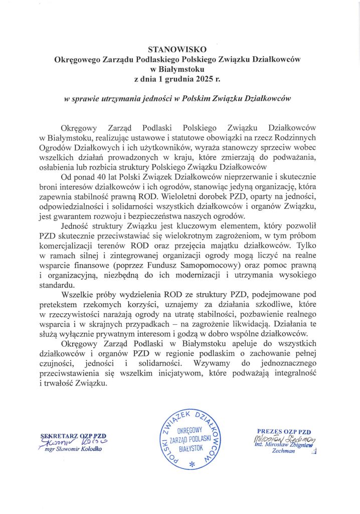 Stanowisko Okręgowego Zarządu Podlaskiego Polskiego Związku Działkowców w Białymstoku w dnia 1 grudnia 2025 r. w sprawie utrzymania jedności w Polskim Związku Działkowców – 09.12.2025