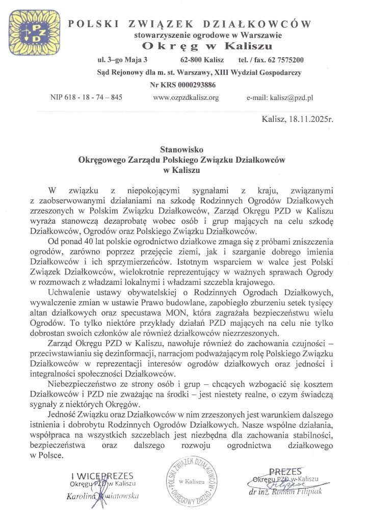 Aktualności Listy, Komunikaty Stanowisko Okręgowego zarządu Polskiego Związku Działkowców w Kaliszu – 02.12.2025 2 grudnia 2025 OZO PZD