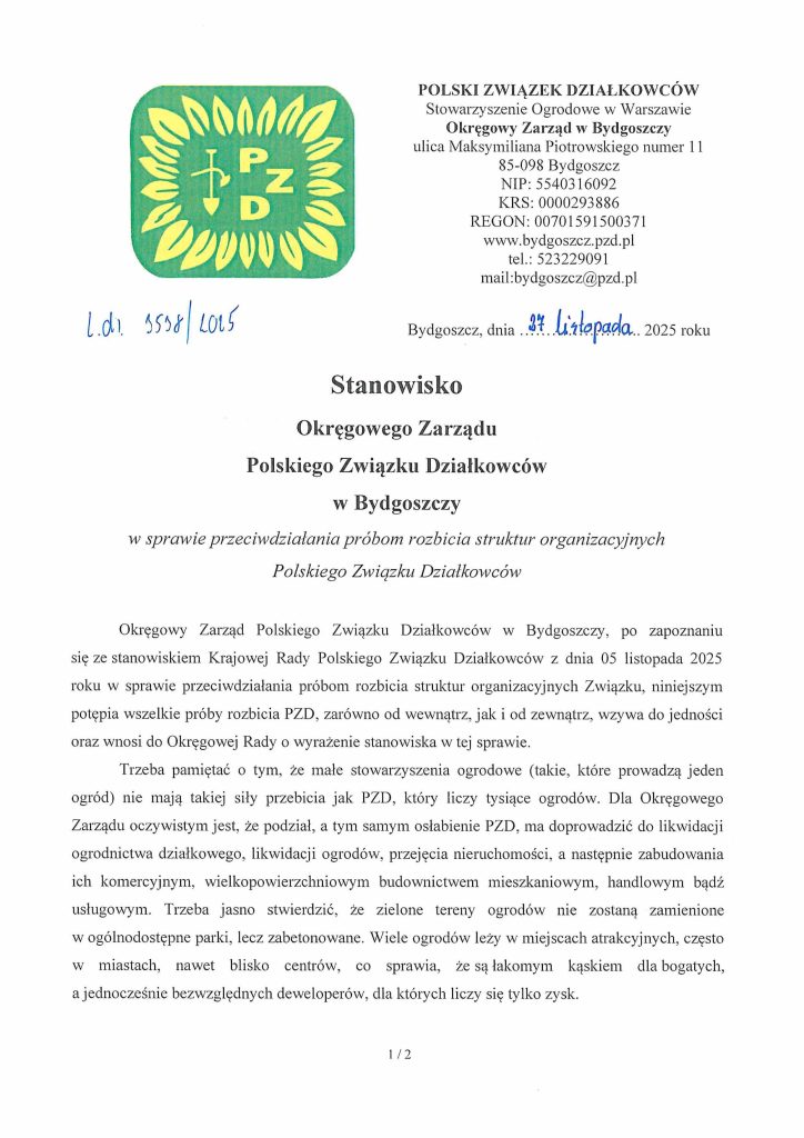Aktualności Listy, Komunikaty Stanowisko Okręgowego Zarządu PZD w Bydgoszczy w sprawie przeciwdziałania próbom rozbicia struktur organizacyjnych PZD – 28.11.2025 1 grudnia 2025 OZO PZD