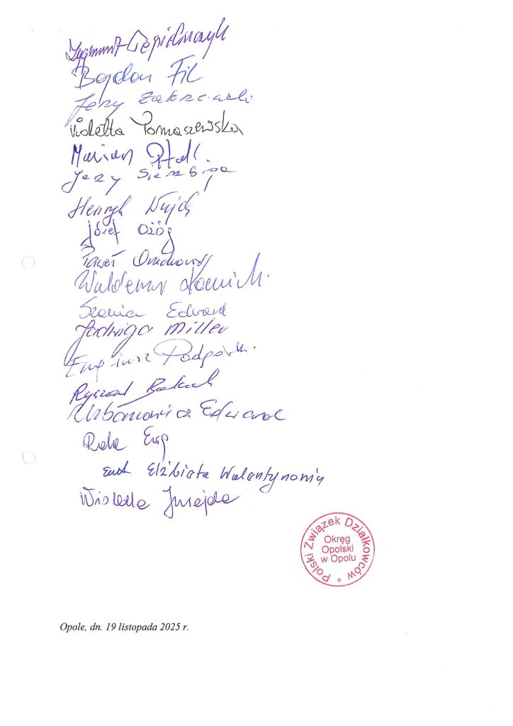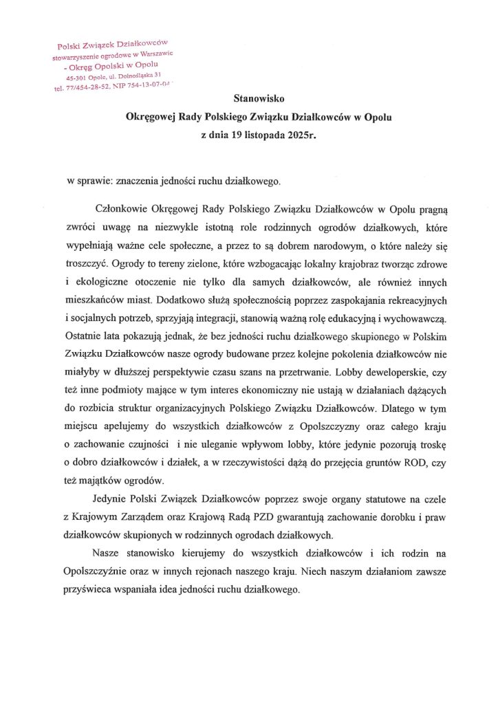 Stanowisko Okręgowej Rady PZD w Opolu z dnia 19.11.2025 r. ws. znaczenia jedności ruchu działkowego