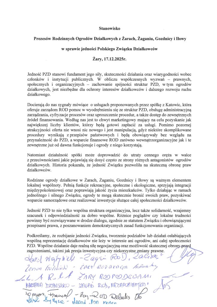 Aktualności Listy, Komunikaty Stanowisko Prezesów Rodzinnych Ogrodów Działkowych z Żar, Żagania, Gozdnicy i Iłowy w sprawie jedności Polskiego Związku Działkowców – 19.12.2025 22 grudnia 2025 OZO PZD