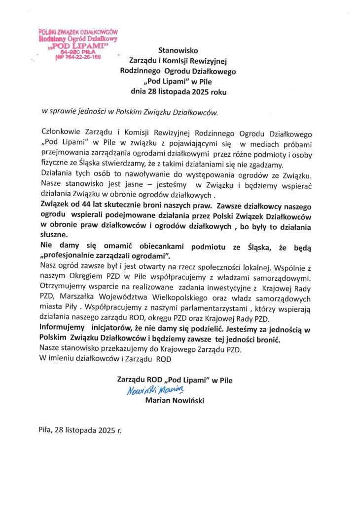 Stanowisko Zarzadu i Komisji Rewizyjnej ROD „Pod Lipami” w sprawie jedności w PZD – 02.12.2025