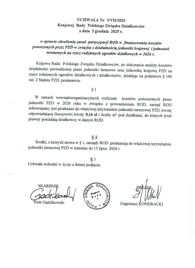 Krajowa Rada PZD wysokość partycypacji w finansowaniu działalności jednostek PZD w kwocie 0,16 zł/m2 powierzchni działki. Ponadto KR PZD ustaliła składkę członkowską na kwotę 10 zł.