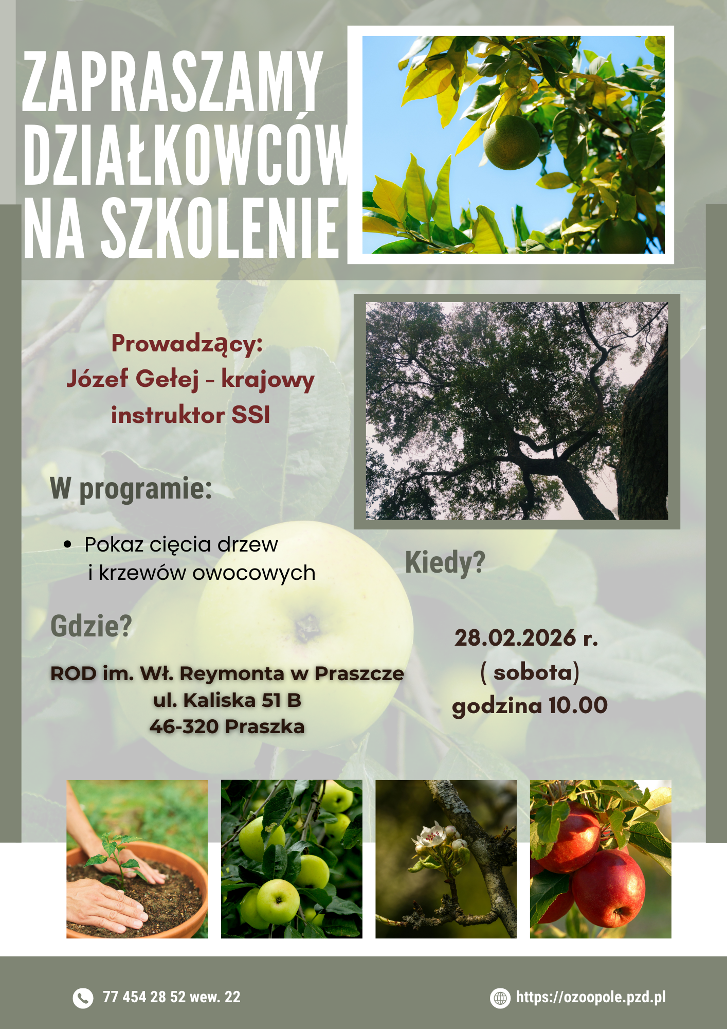 Aktualności Szkolenia Zapraszamy na Pokaz cięcia drzew i krzewów owocowych w dniu 28 lutego 2026 roku o godzinie 10.00 w ROD im. Wł. Reymonta w Praszce 17 lutego 2026 OZO PZD
