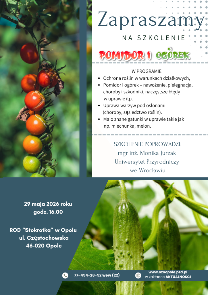 AktualnościSzkoleniaSzkolenia dla nowych działkowców ZAPRASZAMY NA SZKOLENIE DO OPOLA Z OGÓRKA I POMIDORA W DNIU 29 MAJA 2026r. O GODZ. 16.00 24 kwietnia 2026 OZO PZD