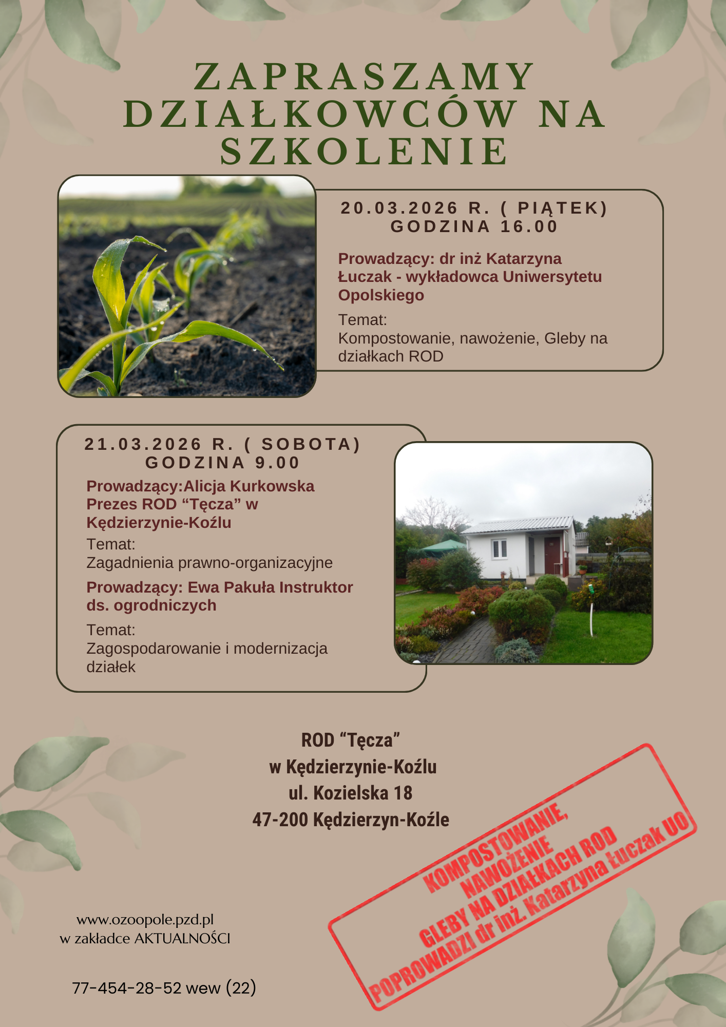 Aktualności Szkolenia Zapraszamy na szkolenie nowych działkowców w dniach 20-21 marca 2026 w ROD „Tęcza” w Kędzierzynie-Koźlu 4 marca 2026 OZO PZD