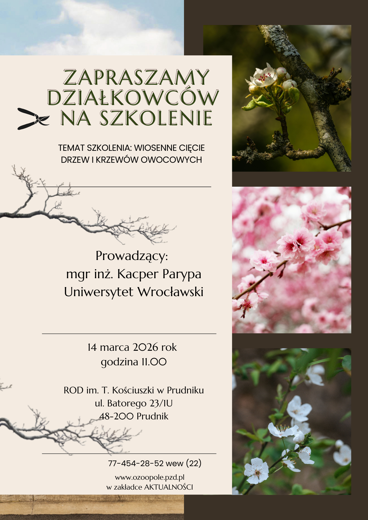 Aktualności Szkolenia Zapraszamy na szkolenie z cięcia drzew i krzewów w ROD im. T. Kościuszki w Prudniku -14 marca 2026 roku o godzinie 11.00, które poprowadzi mgr inż. Kacper Parypa z Uniwersytetu we Wrocławiu 9 marca 20269 marca 2026 OZO PZD